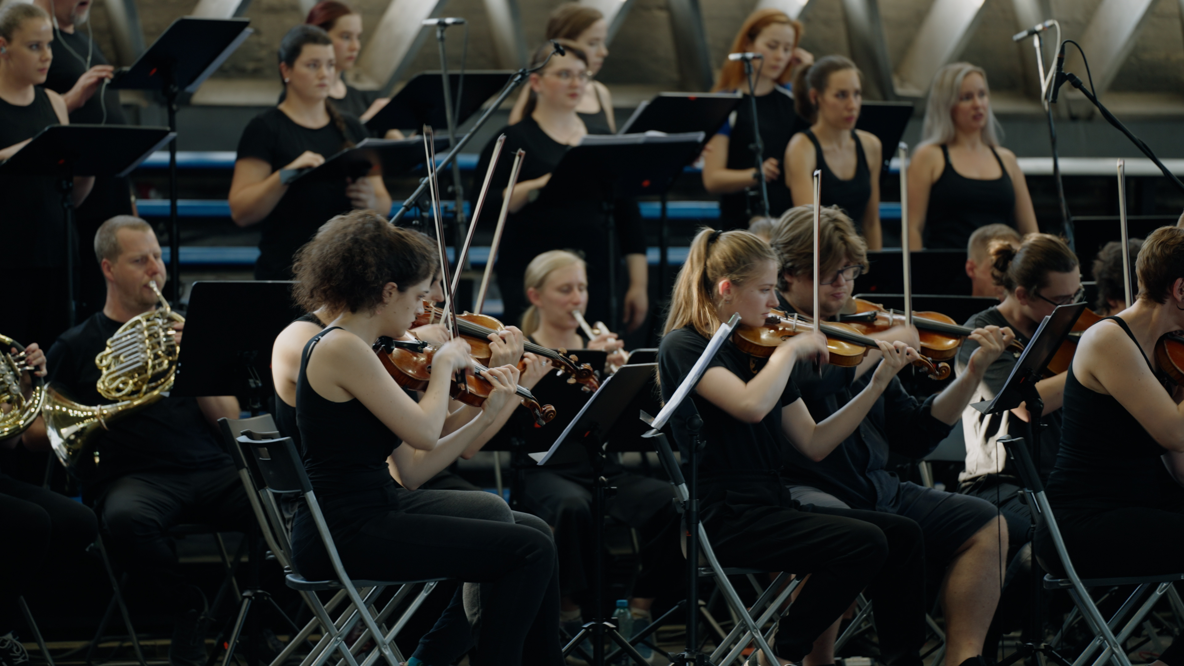 Presented on a 360° stage, opera singer Katsiaryna Zhynhiarouskaya, artist and professional stuntwoman Helga Wretman, and professional film stunt coordinators and riggers Alexander Kusmak and Marten Baum, interact with Shpilman’s musical score with epic orchestrations, sound effects, and foley sounds craftsmanship. Trapped within the confines of the stage, each of these four individuals embodies the intensity of the situations before them, coalescing into an undivisive organism.